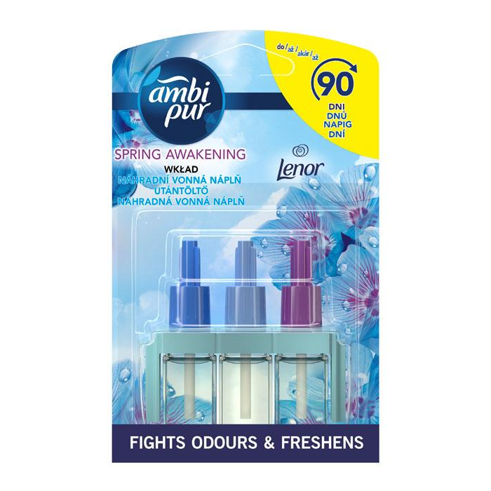 Ambi Pur 3Volution Spring Awakening nepretržite odstraňuje pachy a strieda 3 vzájomne sa doplňujúce vône pre sviežosť, ktorú budete vnímať. Vydrží až 90 dní (pri používaní 12 hodín denne s nastavením najnižšej úrovne odparovania). Objavte krásu Spring Awakening s intenzívnejšou vôňou s väčším dosahom, ktorá naplní miestnosť vôní. Spring Awakening je ľahká vôňa zelene inšpirovaná jarnou prirodzenou sviežosťou Lenoru. Vnímajte pokoj, ktorý vás obklopí, keď sa vzduch naplní touto čistou a decentnou vôňou. U bežných elektrických osviežovačov si na vône rýchlo zvykneme a prestaneme ich vnímať. Ambi Pur Osviežovač vzduchu 3Volution sviežosť obnovuje tým, že sa každých 45 minút automaticky striedajú 3 ° vzájomne sa doplňujúce, vysoko kvalitné vône. Náplne Ambi Pur 3Volution používajte s odparovacím strojčekom 3 Volution, aby ste naplnili váš domov sviežosťou a vôňou, ktorú budete vnímať deň čo deň, týždeň čo týždeň. 3Volution taktiež umožňuje nastaviť intenzitu odparovania vône.