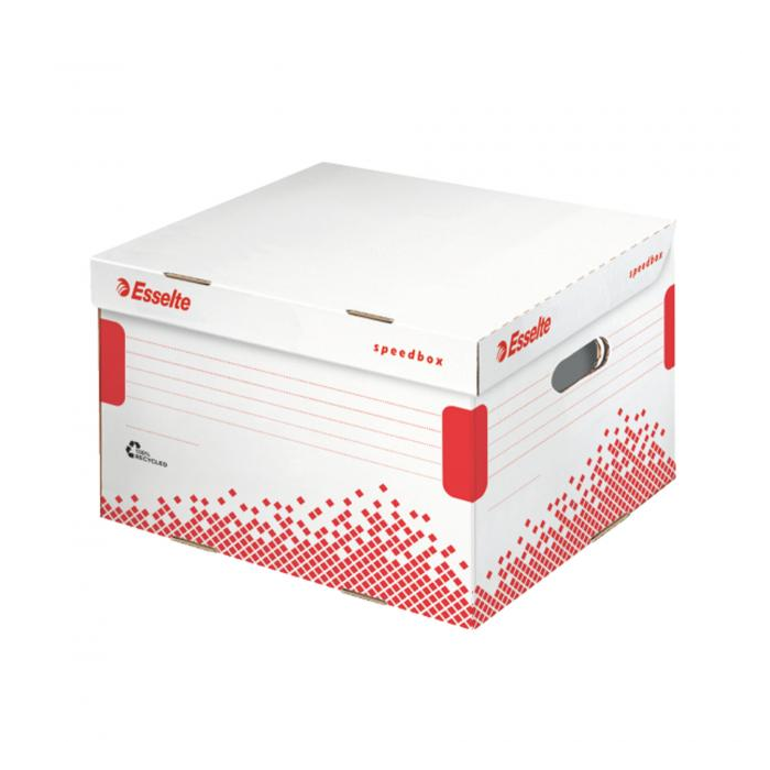 Archívne krabice so sklápacím vekom z archivačného systému Speedbox. Spevnené steny aj dno pre maximálnu pevnosť a odolnosť pri stohovaní. Ideálne na prenos dokumentov alebo rôznych predmetov. Vyrobené zo 100% recyklovanej vlnitej lepenky. Farba biela/ červená. Rozmery 433 × 263 × 364 mm. Kapacita 4 archívne boxy Speedbox 100 mm alebo 5 boxov 80 mm. Väčšie balenie 15 kusov.