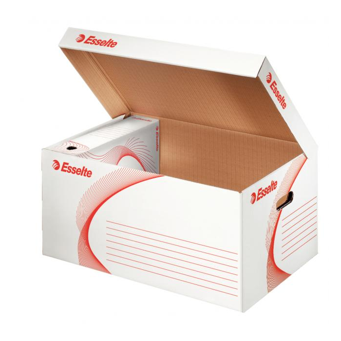 Archívna krabica na ukladanie a archiváciu archivačných boxov. Bočné otvory na prenášanie, sklápacie veko, predtlač na popis na veku i bokoch. Stabilita pri stohovaní je zaisťovaná vzájomným spojením krabíc pomocou špeciálnych otvorov a úchytov. Väčšie balenie 10 ks. Kapacita: 6 archívnych boxov so šírkou chrbta 8 cm alebo 5 archívnych boxov so šírkou chrbta 10 cm.