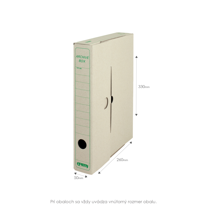 Ekologický výrobok. Box z recyklovateľnej špeciálne impregnovanej lepenky odolnej voči atmosferickej vlhkosti na dlhodobé uloženie záznamov. Tri varianty postavenia, kvalitná sieťotlač. Vhodný v kombinácii so skupinovým boxom. Väčšie balenie 25 ks. Rozmery (š x v x d) 50 x 330 x 260 mm.