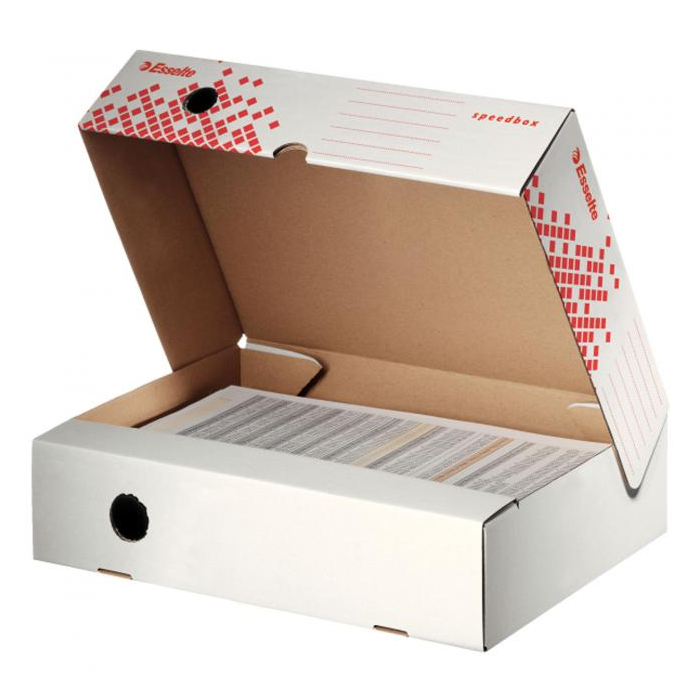 Horizontálny archívny box z archivačného systému Speedbox. Široké otvorenie zabezpečuje jednoduchšie vloženie dokumentov. Vhodný pre dokumenty formátu A4. Ideálna veľkosť pre archiváciu v policiach,určené pre vertikálnu a horizontálnu archiváciu. Vyrobený zo 100% recyklovanej vlnitej lepenky. Rozmery:80 x 250 x 350mm. Väčšie balenie 25 kusov.