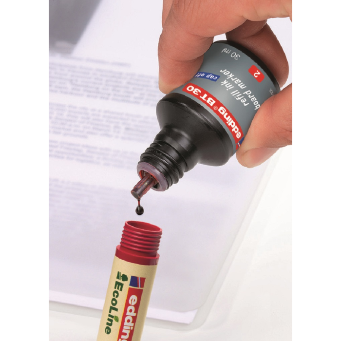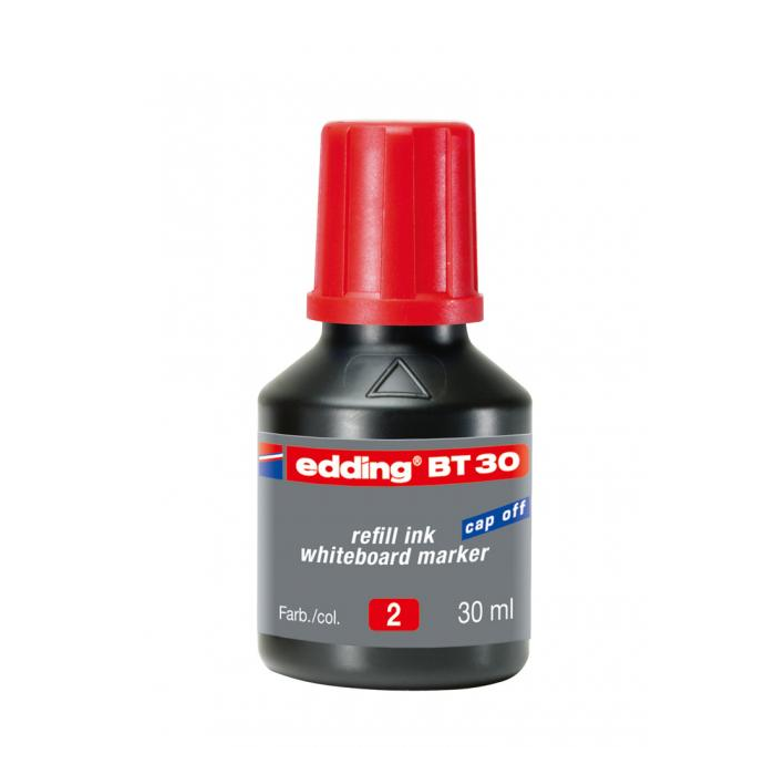Atrament slabého zápachu vo fľaštičke s kvapkovým dávkovačom na dopĺňanie popisovačov edding 250, 361 a 365, určených na biele tabule. Tento chemický prípravok je nebezpečný. Obsah fľaštičky 30 ml. Farba: červená