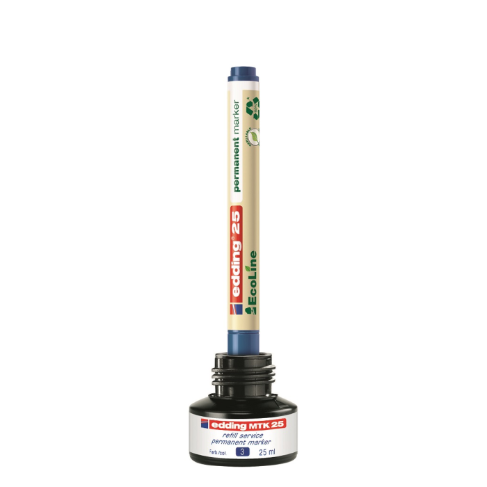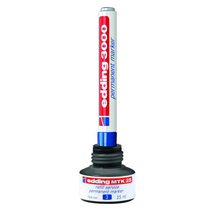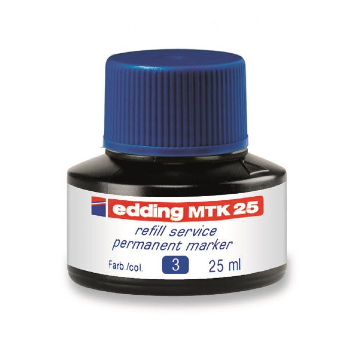 Atrament slabého zápachu s kapilárnym systémom na dopĺňanie permanentných popisovačov edding 2000/-2000 C, 2200/-2200 C, 400, 300, 330 a 370. Obsah 25 ml. Tento chemický prípravok je nebezpečný. Pri dopĺňaní vložte prednú časť popisovača špičkou do fľaštičky a po niekoľkých minútach bude popisovač pripravený k opätovnému použitiu. Obsah 25 ml.