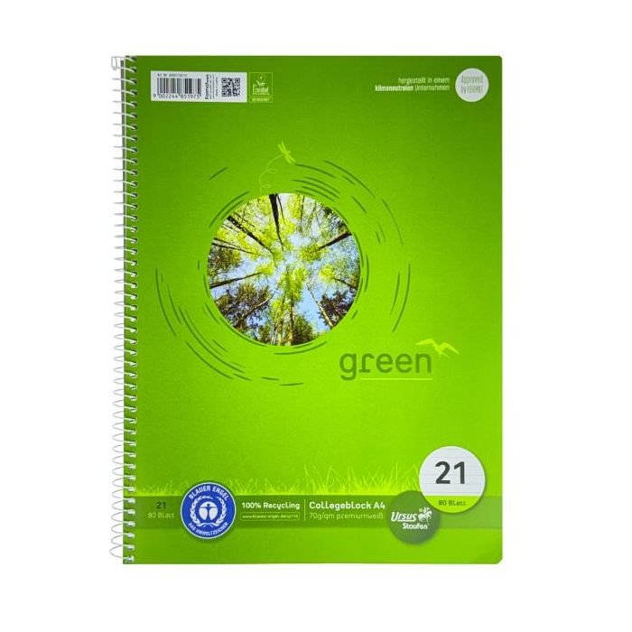 Ursus® Green - krúžkový blok so špirálou na boku vyrobený z vysoko kvalitného písacieho papiera s hmotnosťou 70 g / m2. 100%, papier vyrobený výlučne z recyklovaných vlákien
