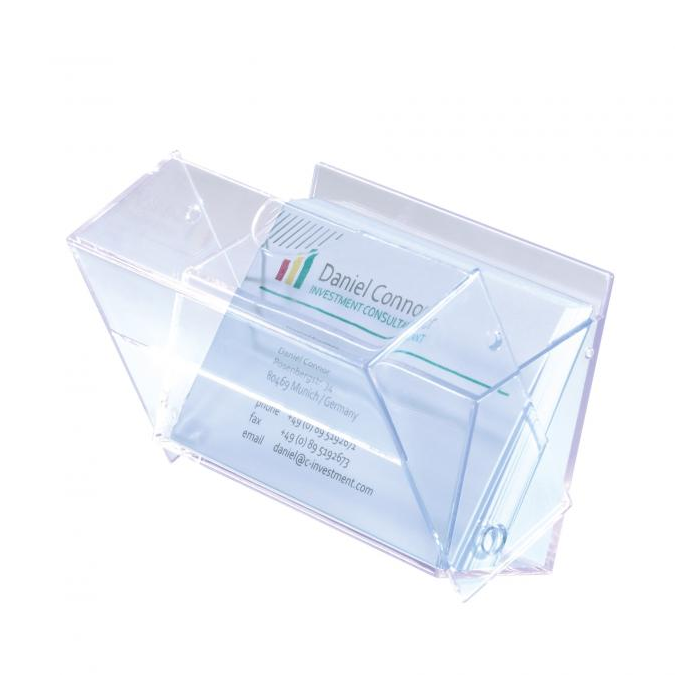 Priehľadný box na vizitky vyrobený z tvrdého plastu s praktickou doplnkovou funkciou: pri zatvorení bezpečne uchováva vložené vizitky a pri otvorení sa zmení na displej s vizitkami. Kapacita až 100 vizitiek (max. 86 × 56 mm). Vonkajšie rozmery (š × h × d) 95 × 60 × 30 mm.
