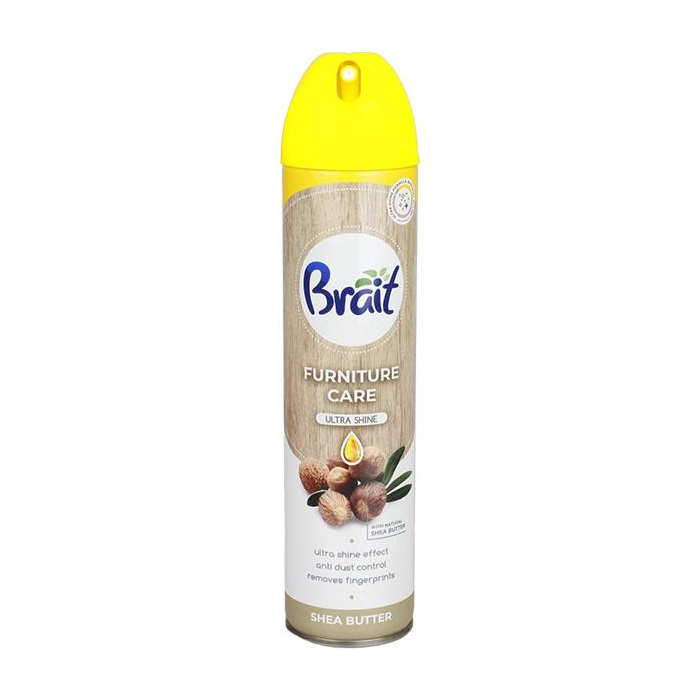 Brait sprej na nábytok je ideálny prípravok na čistenie všetkých drevených a drevu podobných povrchov. Vďaka modernej receptúre Protect System+ s prídavkom včelieho vosku sprej odstráni všetky nečistoty a ochráni nábytok, škrabancami a škvrnami od vody. Zanecháva krásny lesk a príjemnú, medovú vôňu. Objem balenia 350 ml.