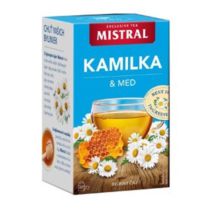 Aromatizovaný bylinný čaj s príchuťou Rumanček a med, porciovaný v nálevových vreckách.