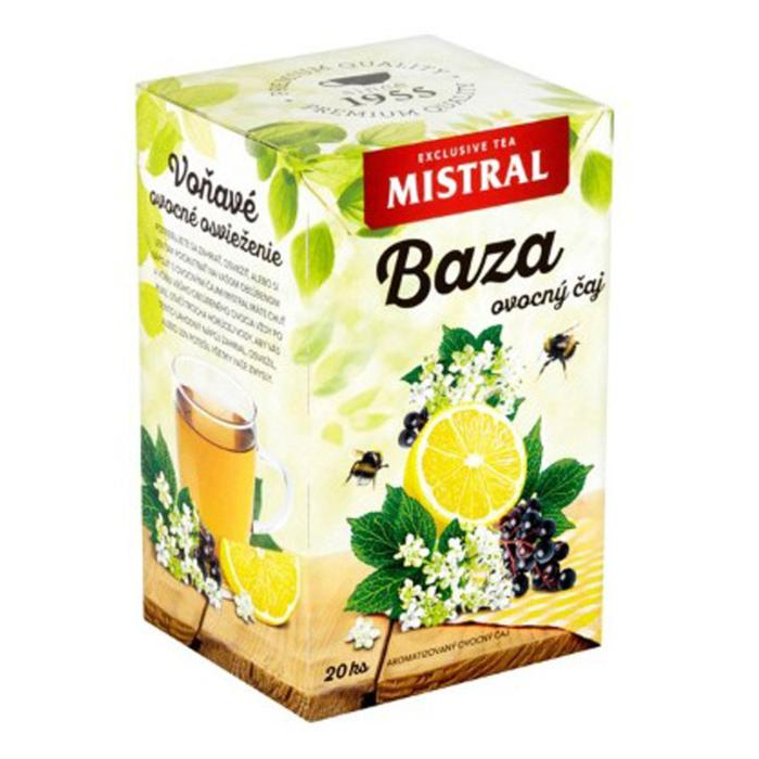 Aromatizovaný ovocný čaj s Bazou čiernou. Porciovaný v nálevových vrecúškach.
