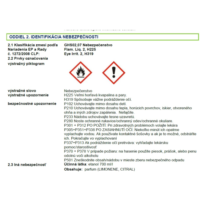 NEBEZPEČENSTVO: H225 Veľmi horľavá kvapalina a pary. H319 Spôsobuje vážne podráždenie očí. Uchovávajtre mimo dosahu tepla, horúcich povrchov, iskier, otvoreného ohňa a iných zdrojov zapálenia. Nefajčite. Nádobu uchovávajte tesne uzavretú. V prípade požiaru: na hasenie použite piesok, prášok alebo penu odolnú voči alkoholu. Noste ochranné rukavice/ochranný odev/ochranné okuliare. PO POŽITÍ: Pri zdravotných problémoch volajte lekára. PO ZASIAHNUTÍ OČÍ: Niekoľko minút ich opatrne vyplachujte vodou. Ak používate kontaktné šošovky a ak je to možné, odstráňte ich. Pokračujte vo vyplachovaní. Ak podráždenie očí pretrváva: vyhľadajte lekársku pomoc/starostlivosť. Zneškodnite obsah/nádobu v mieste zberu nebezprečného odpadu.
