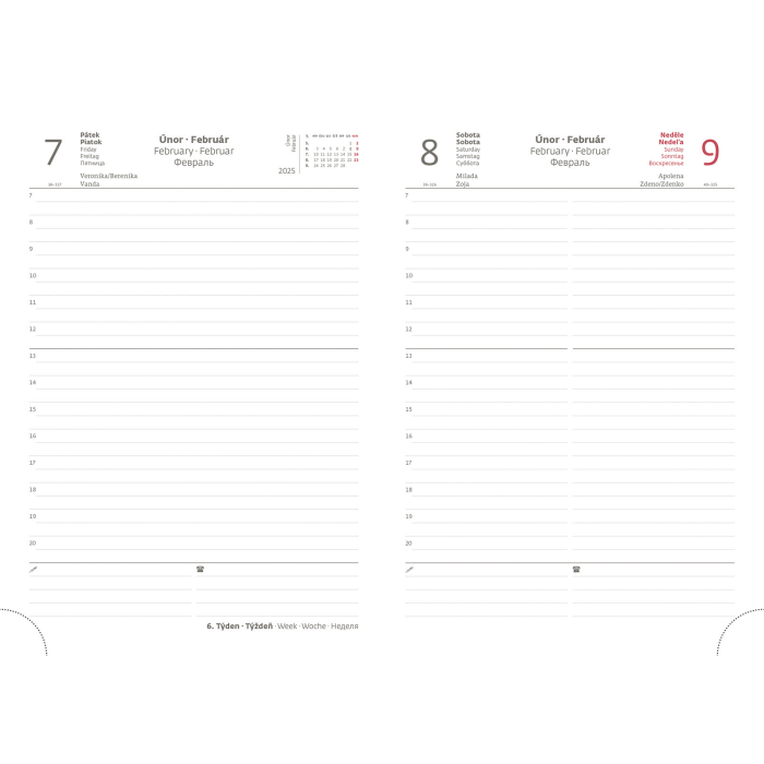 Diár obsahuje: osobné údaje, plánovač dovolenky (mesačný prehľad), plánovací kalendár, telefónne predvoľby, štátne sviatky Českej a Slovenskej republiky, medzinárodné sviatky, ročný výhľad, denný layout, adresár, mapa Európy a Českej a Slovenskej republiky.
