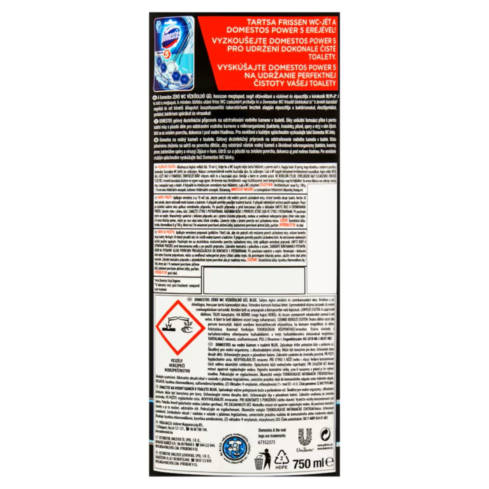 Domestos na vodný kameň v toalete. Gélový dezinfekčný prípravok na odstraňovanie vodného kameňa v toalete. Vďaka jedinečnému zloženiu sa udrží na povrchu dlhšie, aby odstránil všetok vodný kameň a likvidoval mikroorganizmy (baktérie, kvasinky, plesne, bakteriálne spóry a vírusy) žijúce v ňom. Udrží sa a pôsobí na zvislom povrchu, dokonca aj pod vodnou hladinou
