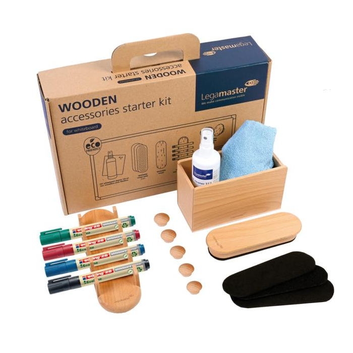 Štartovacia súprava obsahujúca 17 nástrojov na optimálne využitie všetkých tabúľ Legamaster a udržiava poriadok v kancelárii. Produkty obsahujú materiál z dobre spravovaných lesov s certifikátom FSC® a iných kontrolovaných zdrojov (FSC C158462) Obsah: 1x drevená stierka, 3x náhradné náplne do stierky, 1x drevený držiak na príslušenstvo, 1x drevený držiak popisovačov, 5x drevené magnety, 4x Eco‑ Line 28 - popisovačov na tabuľu (čierna, červená, modrá, zelená), 1x čistič tabúľ TZ7 125ml, 1x utierka z mikrovlákna 40x40cm. Dodávané, znovu naplniteľné popisovače sú klimaticky neutrálne, pretože sú vyrobené z 90 % recyklovateľných materiálov.