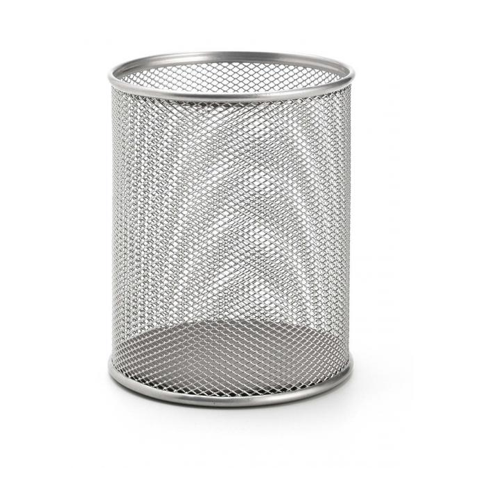 Stojan na ceruzky a perá v drôtenej úprave. Priemer 90 mm, výška 100 mm. Farba strieborná.