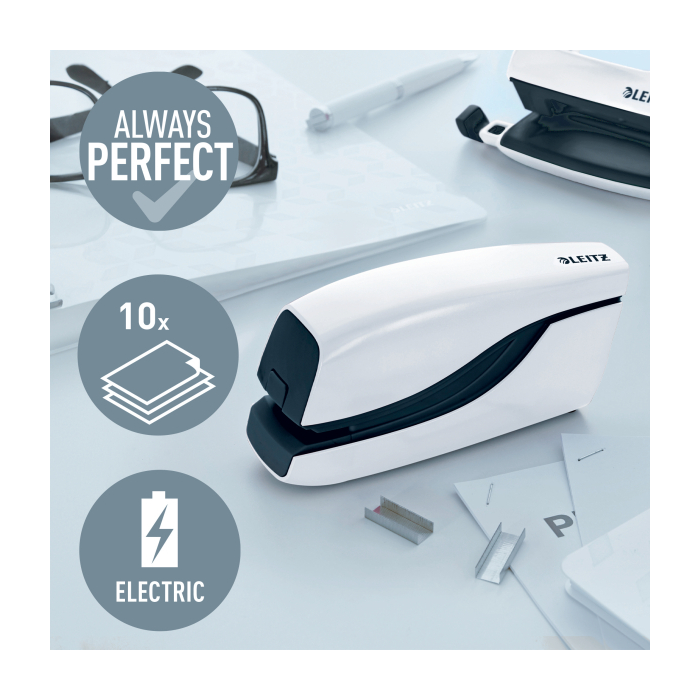Elektrická zošívačka Leitz New NeXXt WOW. Vďaka jednoduchému ovládaniu jednou rukou je ideálna na časté používanie.