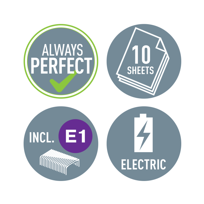 Technológia s napájaním na batérie na zošívanie v pohybe. V žiarivých farbách WOW. Batérie (4× 1,5 V AAA LR03) nie sú súčasťou balenia. Kapacita 10 listov. Náhradné spinky ES556800. Farba purpurová.