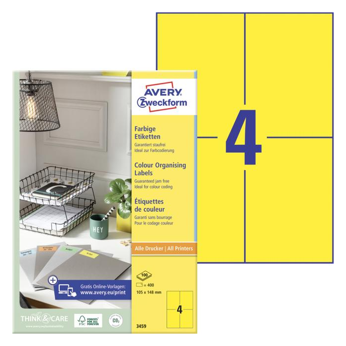 Etikety farebné 105x148mm Avery A4 100 hárkov žlté