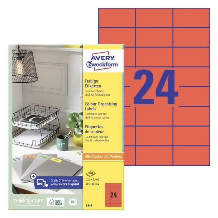 Etikety farebné 70x37mm Avery A4 100 hárkov červené