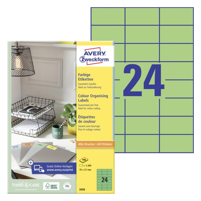 Etikety farebné 70x37mm Avery A4 100 hárkov zelené