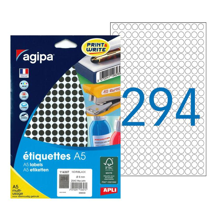 Etikety kruhové 8mm Agipa A5 čierne