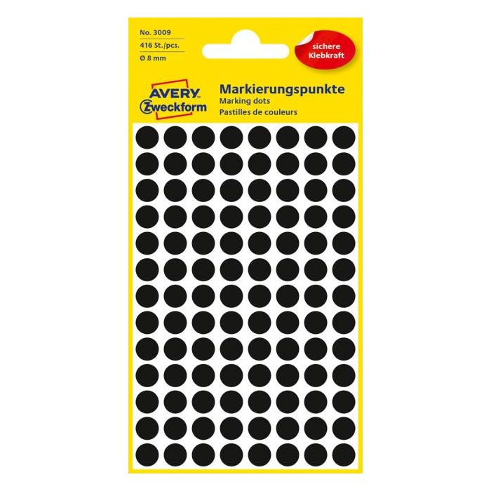 Kruhové etikety na ručný popis. Priemer 8 mm. Farba čierna. Etikety v balení : 416 kusov.