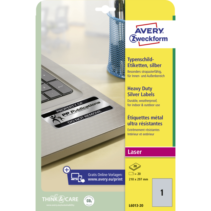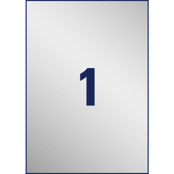 Veľmi odolné polyesterové etikety odolné voči oleju, prachu, špine, natrhnutiu, vode. Odolávajú teplotám od −40 ° do + 150 °C. Určené pre tlač v laserových tlačiarňach. Vhodné aj pre vonkajšie použitie. Rozmery v mm : 210 × 297. Farba strieborná. Etikety na hárku 1 kus. Balenie 20 hárkov.