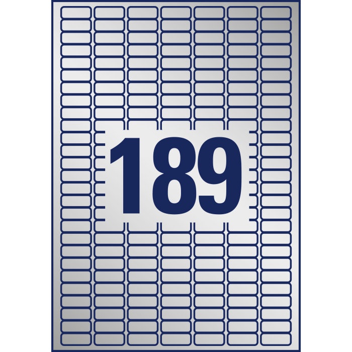 Veľmi odolné polyesterové etikety odolné voči oleju, prachu, špine, natrhnutiu, vode. Odolávajú teplotám od −40 ° do + 150 °C. Určené pre tlač v laserových tlačiarňach. Vhodné aj pre vonkajšie použitie. Rozmery v mm : 25,4 × 10. Farba strieborná. Etikety na hárku 189 kusov. Balenie 20 hárkov.