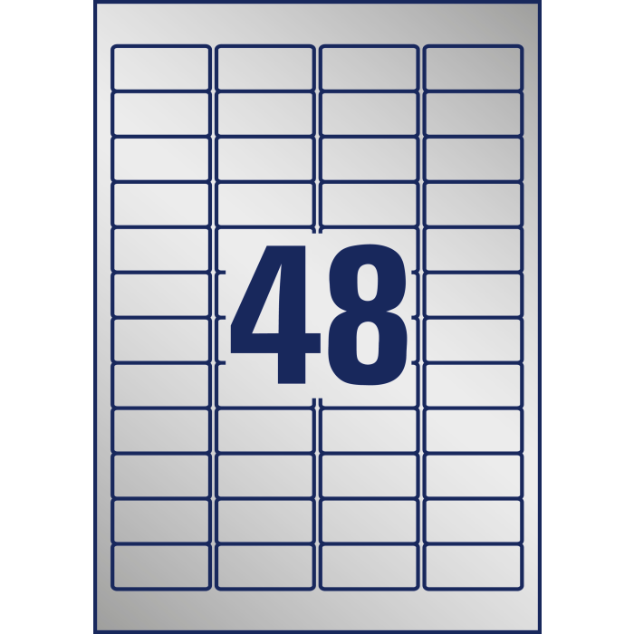 Veľmi odolné polyesterové etikety odolné voči oleju, prachu, špine, natrhnutiu, vode. Odolávajú teplotám od −40 ° do + 150 °C. Určené pre tlač v laserových tlačiarňach. Vhodné aj pre vonkajšie použitie. Rozmery v mm : 45,7 × 21,2. Farba strieborná. Etikety na hárku 48 kusov. Balenie 20 hárkov.