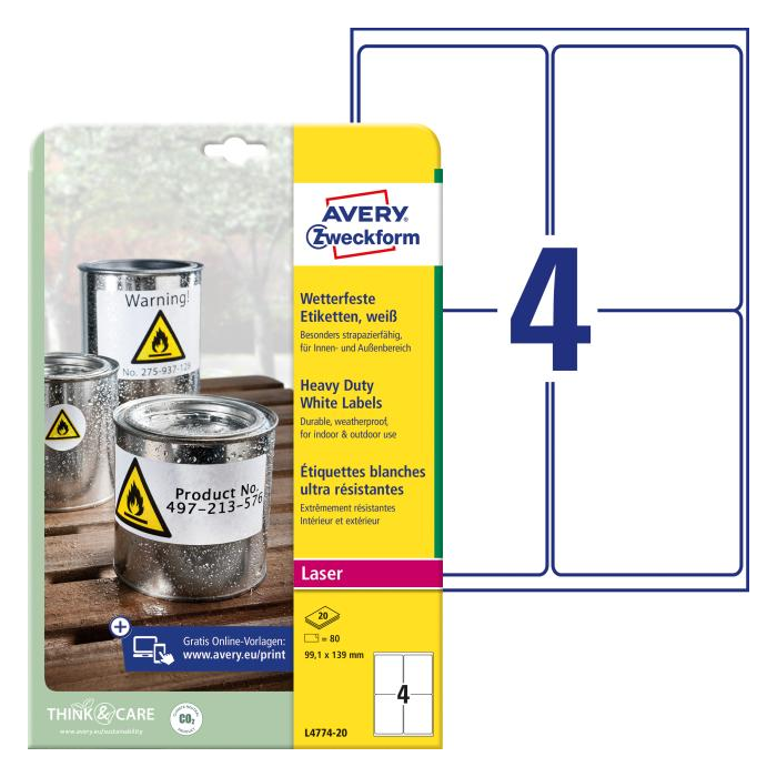 Rozmery v mm : 99,1 × 139. Farba biela. Etikety na hárku 4 kusov. Balenie 20 hárkov.
