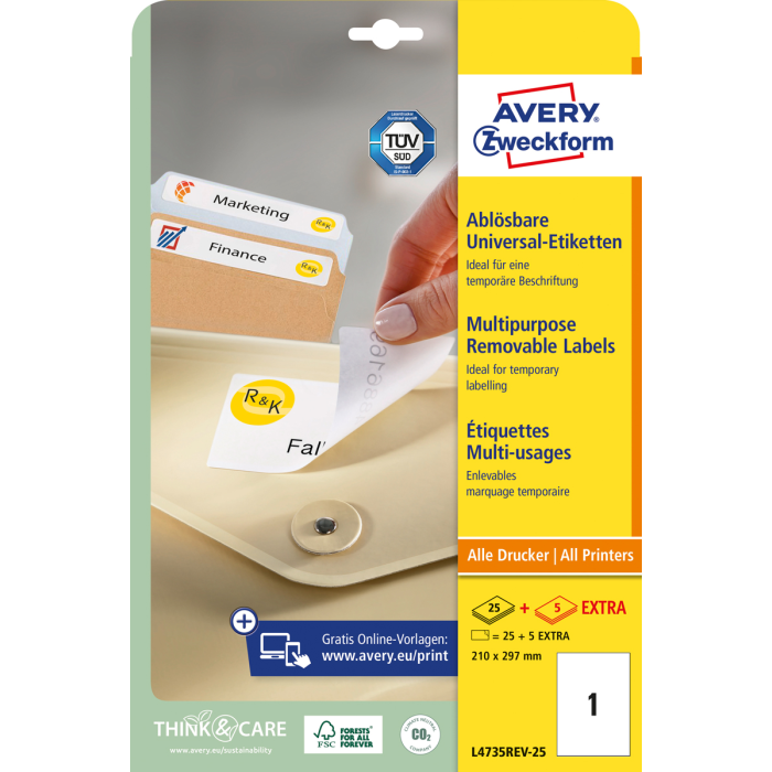 Etikety univerzálne odnímateľné 210x297mm Avery A4 25+5 hárkov