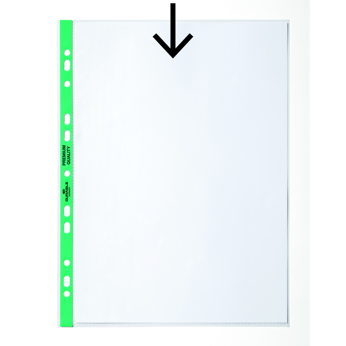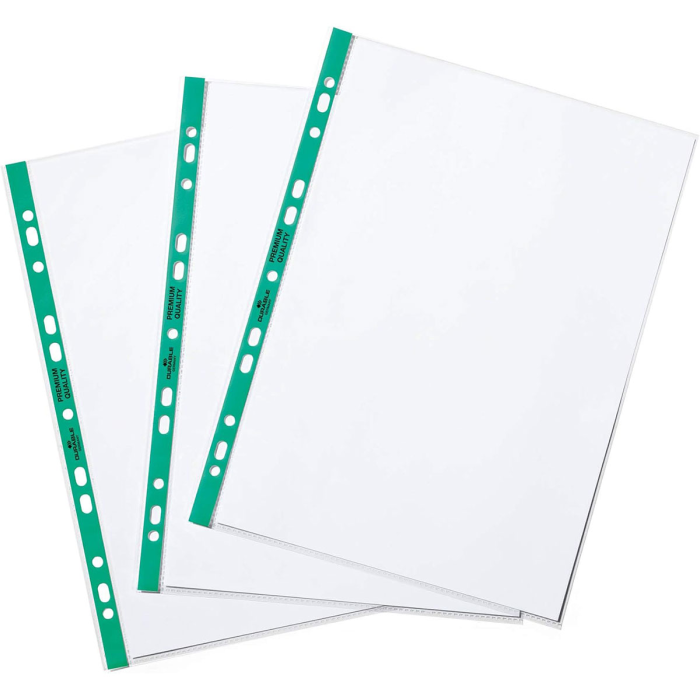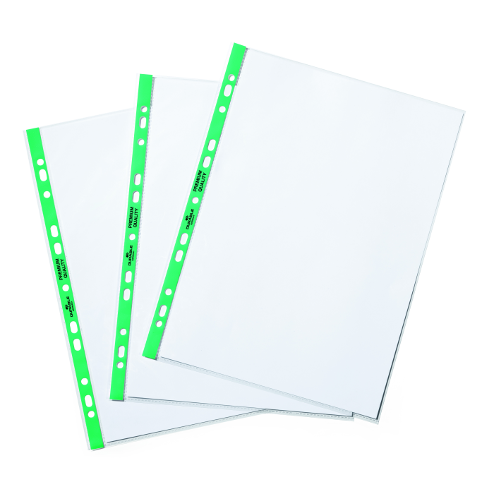 Priehľadné euroobaly z polypropylénu s farebným eurodierovaním. Otvor zhora. Formát A4. Balené v sáčku. Farba okraja zelená. Balenie 100 ks. Hrúbka 90 mic..