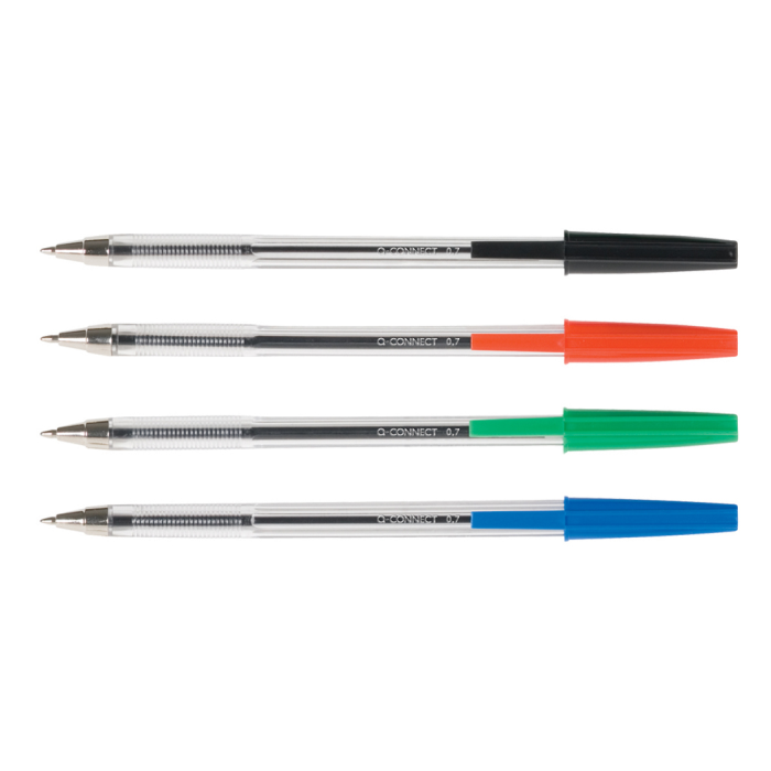 Jednorazové guľôčkové pero s priehľadným telom a viditeľnou farbou atramentu. Guľôčka 1 mm, širka stopy 0,7 mm. Väčšie balenie 20 ks v jednej farbe. Farba náplne červená.