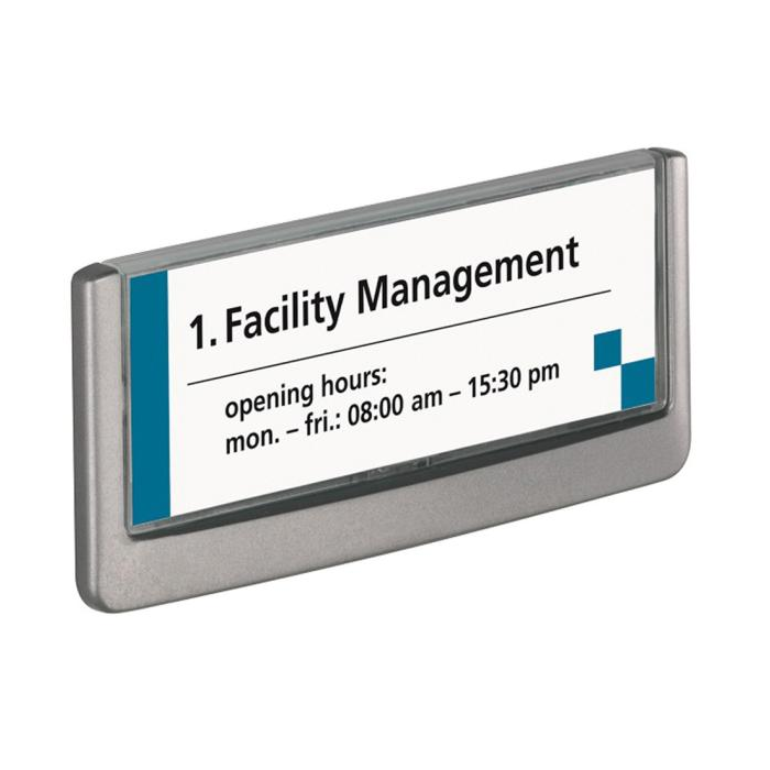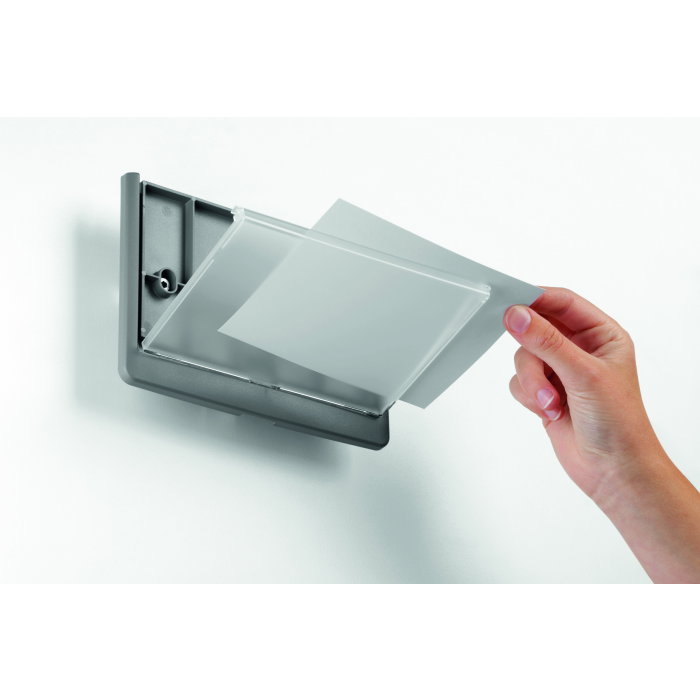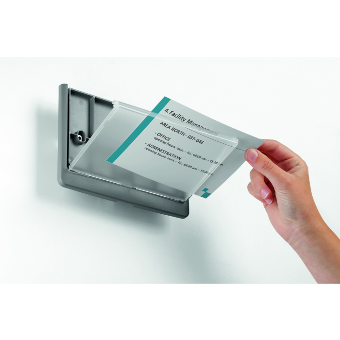 Moderná informačná tabuľka na dvere s lemom v atraktívnej grafitovej farbe. Predný panel sa otvára na jedno zatlačenie, a tým sa jednoducho sprístupnia vložené popisné papiere, ktoré sa môžu vymieňať podľa potrieb. Tabuľka je ideálna do kancelárií, úradov, škôl, univerzít a hotelov. Súčasťou balenia je montážna sada s názorným návodom. Namiesto pevného montovania môže byť tabuľka k povrchu aj prilepená.