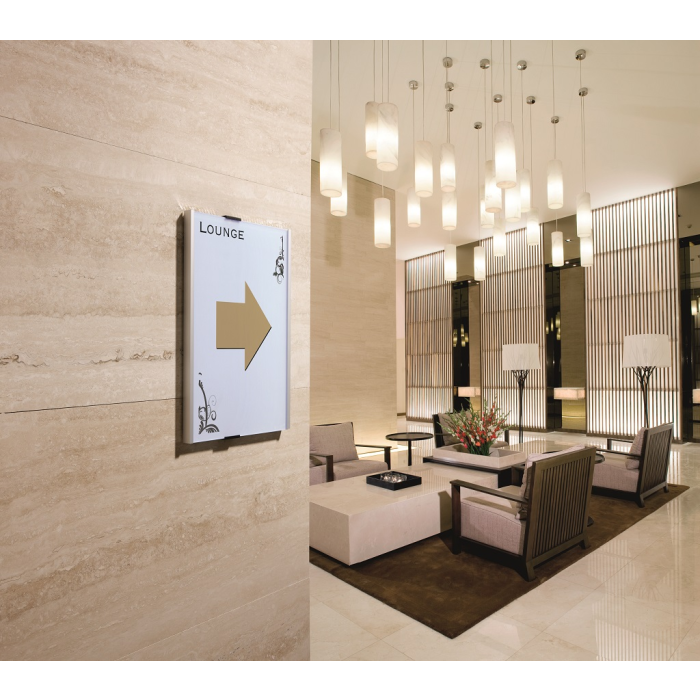 Informačná tabuľka na dvere. Štylizovaná tabuľka vo vrúbkovanej úprave, spodná časť z vysoko kvalitného hliníka, fixujúce spojky v čiernej farbe. K podkladu môže byť zadnou časťou priskrutkovaná alebo nalepená. Text je chránený neoslňujúcim akrylátovým krytom, ktorý pridržiavajú dve fixujúce spojky. Súčasťou balenia je montážna sada s názorným návodom a čistým listom papiera vo veľkosti tabuľky.
