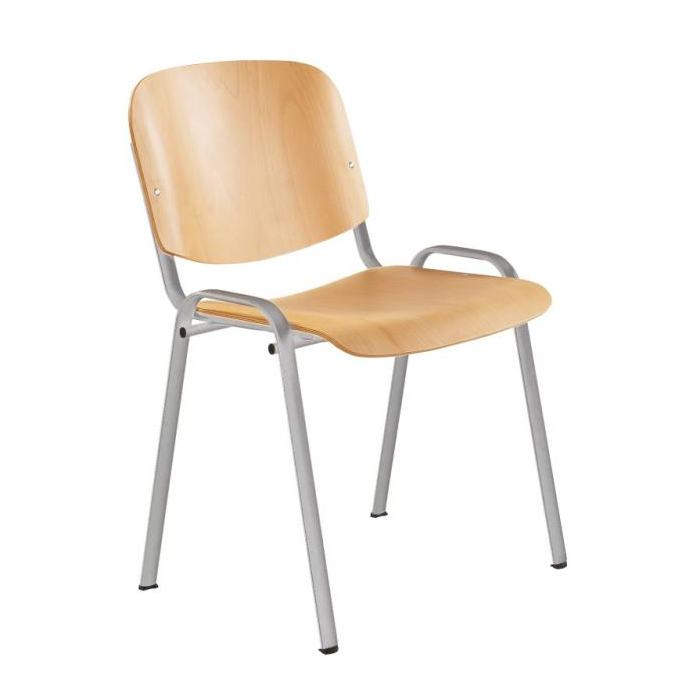 Jedálenská stolička s bukovou lakovanou preglejkou, oceľová podnož oválneho prierezu, strieborný rám RAL 9006.