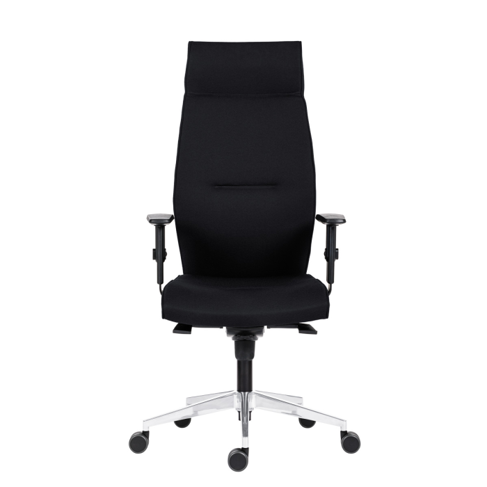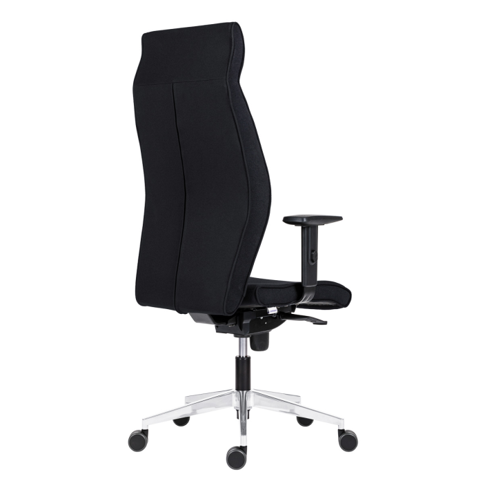 Kancelárske kreslo s opierkou hlavy, výškovo nastaviteľnými podrúčkami a dopredným náklonom sedáku pre zlepšenie krvného obehu.
