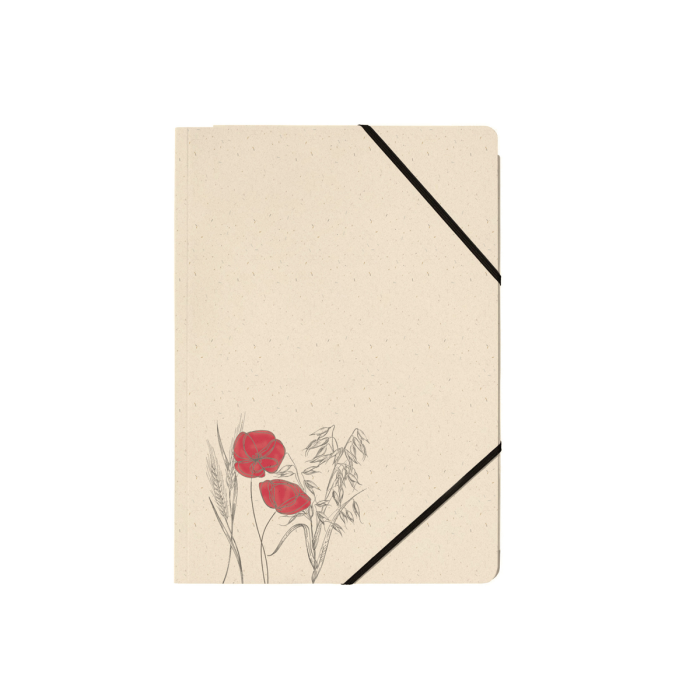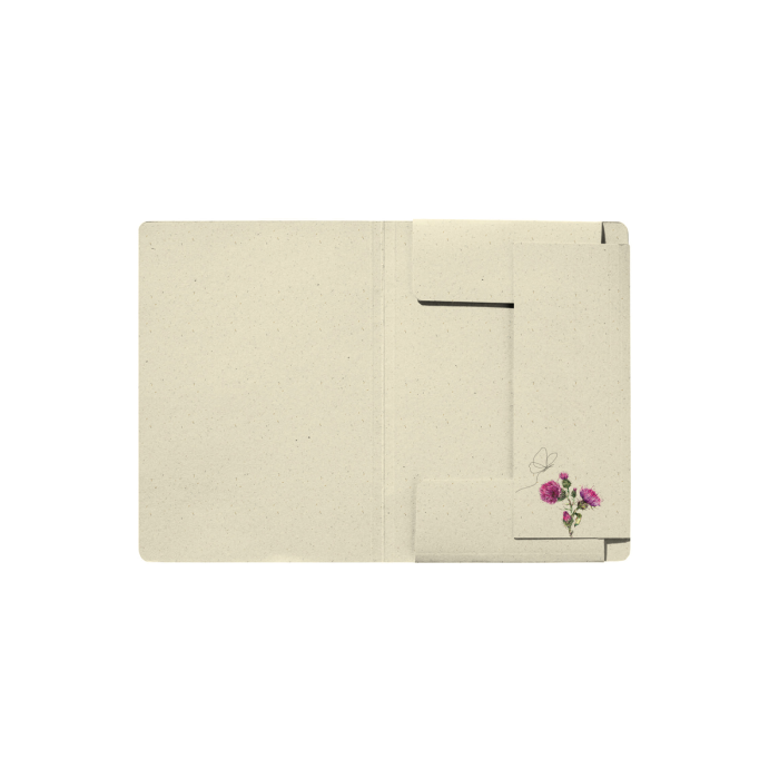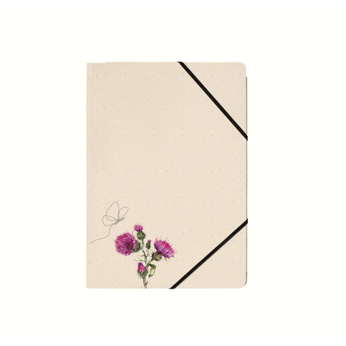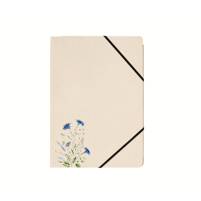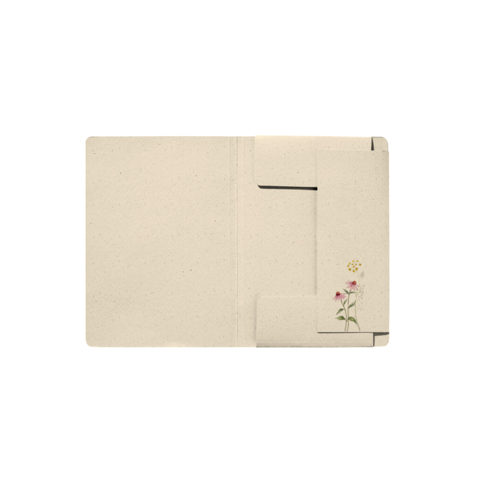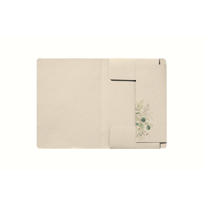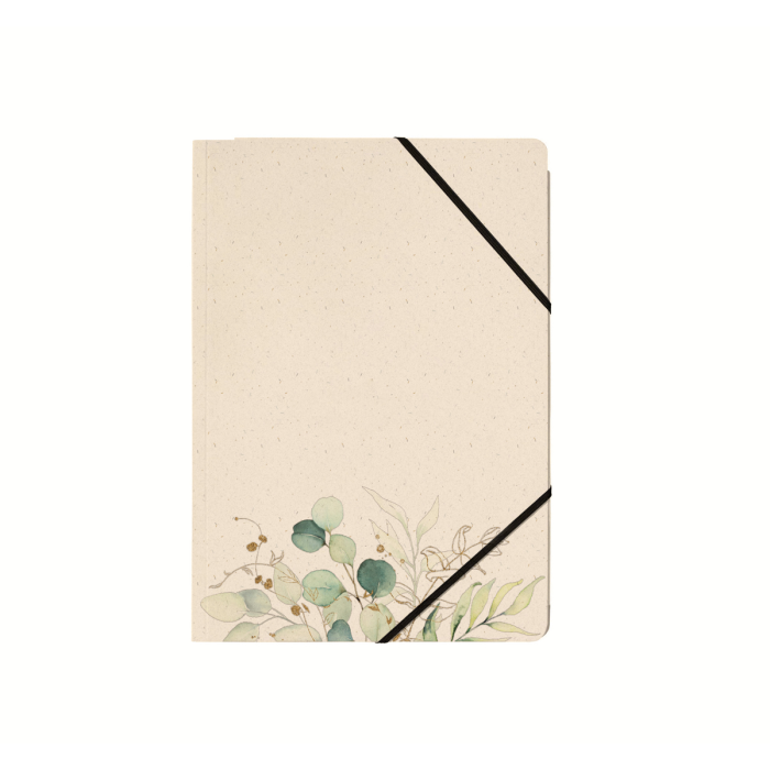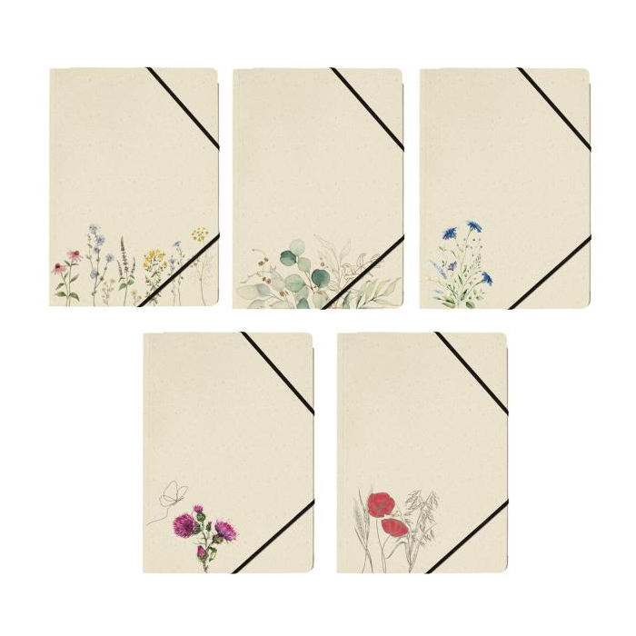 Kartónový obal na dokumenty formátu A4, materiál: trávová lepenka 300 g/m², 5 rôznych prírodných motívov, s čiernou gumičkou v rohoch na zapínanie, s 3 chlopňami na zhromažďovanie a prepravu voľných dokumentov, aj v menších formátoch.