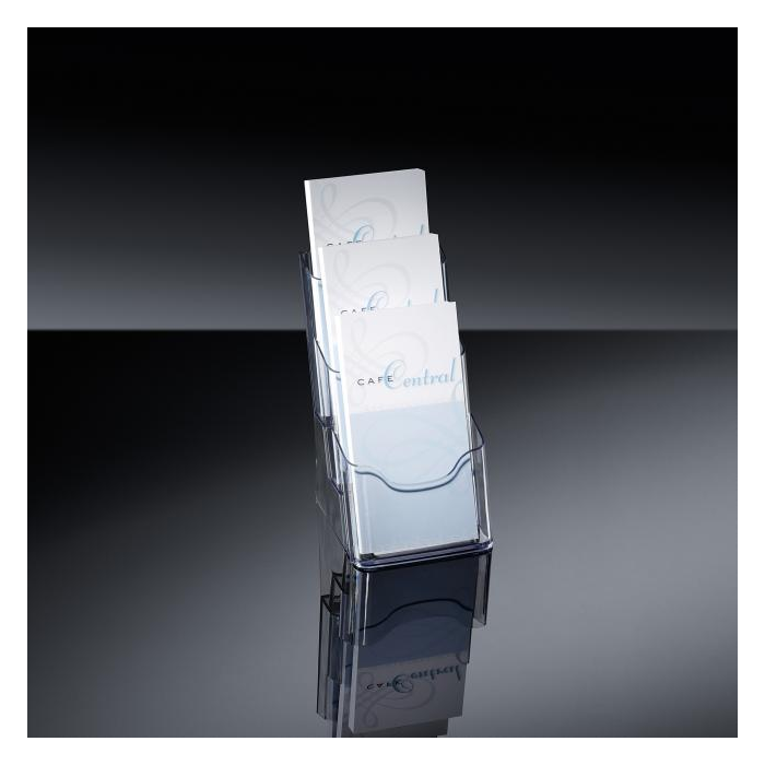 Stolný stojan s tromi odkladačmi unikátneho dizajnu z vysokokvalitného akrylu. Ideálny na brožúry, katalógy a letáky. Hĺbka odkladača 30 mm. 25-ročná záruka na odolnosť voči UV žiareniu. Rozmery 130 × 290 × 150 mm. Farba číra.