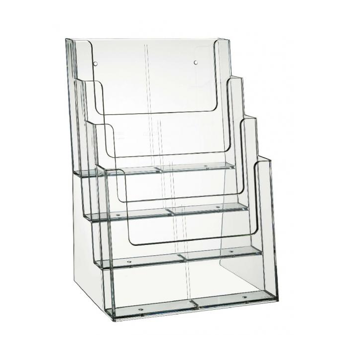 Stojan na prospekty formátu A4 so štyrmi oddielmi. Materiál priehľadný číry plast. Rozmery (š x v x h) 230 x 345 x 170 mm.
