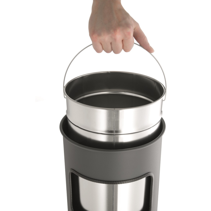 Kovový kôš na odpadky s vyberateľným zinkovým vnútrom a vyberateľným popolníkom naplneným pieskom /1,5 kg/ . Vhodný na použitie v interiéry aj v exteriéry. Objem koša 17 l, výška 620 mm, priemer 260 mm. Objem popolníka 2 l. Farba antracitová.
