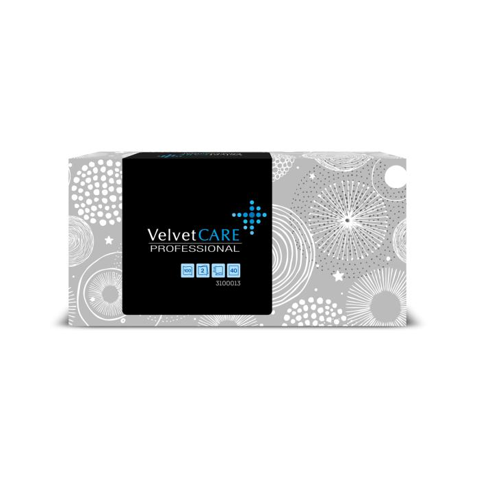 Jemné a pevné dvojvrstvové kozmetické obrúsky VelvetCARE Professional, 100 ks v balení, 100% celulóza. Rozmer vreckovky 20,5 x 21 cm.