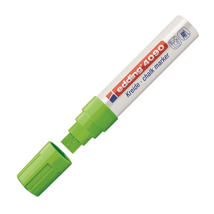Popisovač s kriedovým atramentom neutrálnej vône na báze vody. Vhodný na sklo a takmer všetky druhy nepórovitých povrchov. Atrament rozpustný vo vode, stierateľný vlhkou handričkou. Hrot zrezaný, šírka stopy 4---15 mm. Väčšie balenie 5 ks. Farba: svetlo zelená Hrot: 4-15 mm Typ: zrezaný