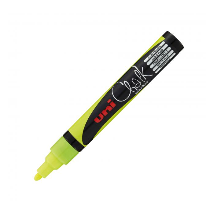 Kriedové popisovače s možnosťou použitia pre priemysel, dekoráciu, informačné tabule a hobby. Na čistých a odmastených neporéznych povrchoch text po zaschnutí odoláva vode a UV, ale je stierateľný vlhkou handričkou. Vhodné na okná, zrkadlá, kovové a plastové povrchy. Hrot guľatý, šírka stopy 1,8 - 2,5 mm. Farba neónovožltá.