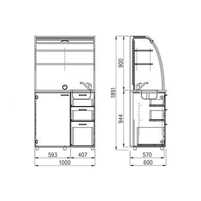 • Vedľa sú umiestnené 3 zásuvky, do ktorých môžete uložiť lyžičky, obrúsky, čistiace prostriedky a pod. V prevedení s drezom je hĺbka dvoch vrchných zásuviek skrátená práve z dôvodu umiestnenia drezu a odpadu, čo je dobre vidieť na technických výkresoch.