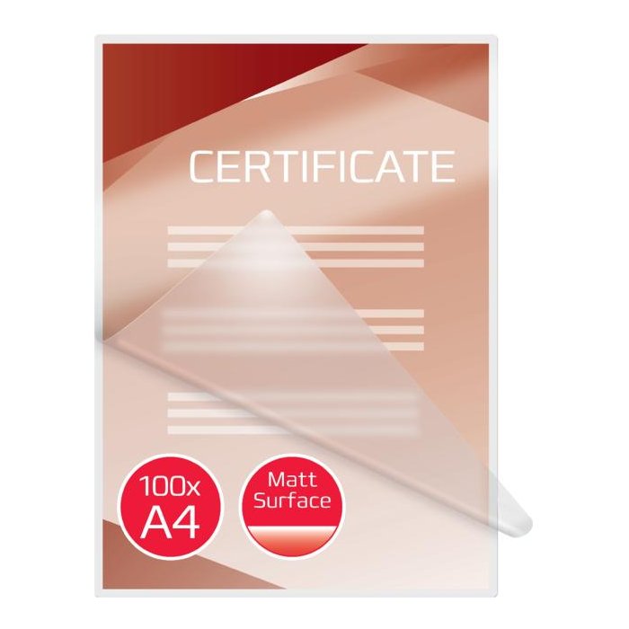 Tuhý matný laminát, ktorý priľne k obom stranám listu, chráni často používané dokumenty, minimalizuje odlesky a umožňuje „popisovanie“. Hrúbka 2 × 100 mikrónov. Formát A4. Balenie: 100 kusov.