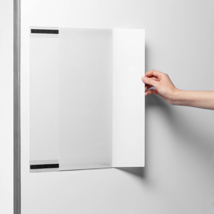 Aplikácia vo formáte na výšku na kovové povrchy Magnetická priľnavosť vďaka dvom magnetickým pásikom na zadnej strane Jednoduchá výmena dokumentov zasunutím z boku Fólia vyrobená z 80 % materiálu rPET (recyklácia po spotrebiteľovi) Separovateľné materiály umožňujú oddelenú likvidáciu a recykláciu materiálov