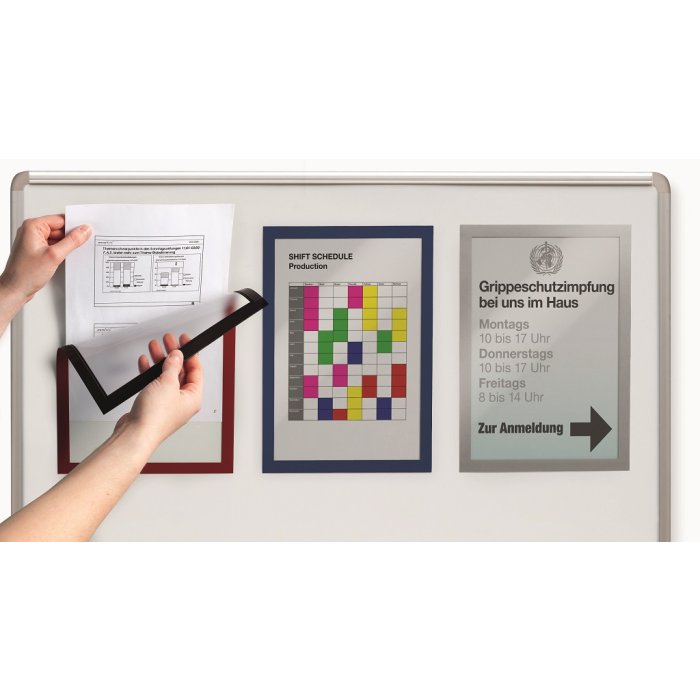 Informačný panel s magnetickou časťou na zadnej strane rámika na jednoduché a rýchle vkladanie informácie formátu A4. Vhodný na hladké magnetické povrchy, napr. magnetickú tabuľu. Farba čiena. V balení 5 ks.