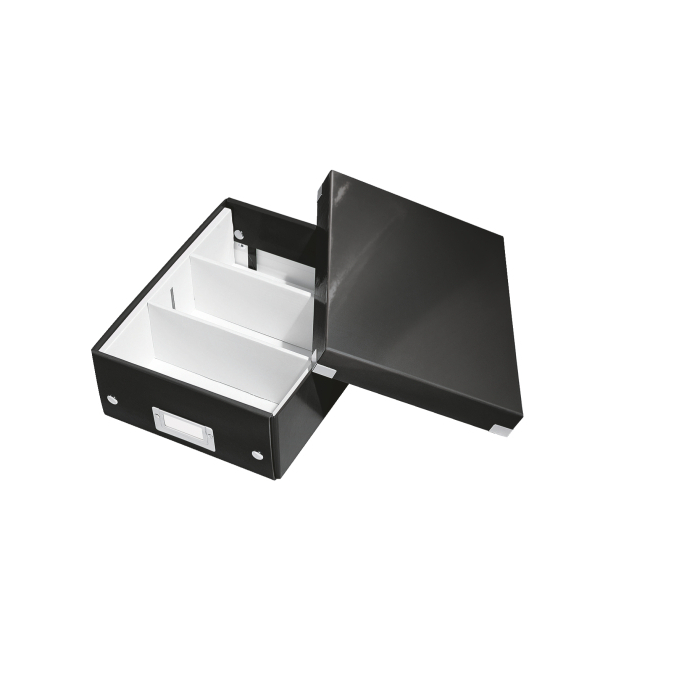 Malá štýlová skladacia krabica s vekom a s rámčekom na štítok. Na usporiadanie nabíjačiek, káblov a ďalšieho vybavenia kancelárie. Veľkosť S. Na prvý pohľad vidíte, čo sa vojde dovnútra! Výška krabice bola navrhnutá tak, aby vám poskytla dostatok priestoru na uloženie príslušenstva a zároveň zabránila skladaniu vecí na seba. Na vylepšenie usporiadania obsahu krabice použite priložený vnútorný systém priehradiek. Môžete rozdeliť krabicu na 2 alebo 3 časti a zabrániť tak miešaniu káblov alebo fotiek. Inteligentná skladacia konštrukcia: rýchle a jednoduché zloženie bez nutnosti použitia skrutiek a možnosť opätovného rozloženia na úsporu miesta, keď krabicu práve nepotrebujete. Moderný vzhľad a farby na skrášlenie vašej kancelárie alebo domova. Lesklé vyhotovenie vytvára prvotriedny vzhľad škatule a umožňuje dlhodobé používanie a jednoduché utieranie prachu. Rámček na štítok pre jednoduché označenie obsahu. Materiál pevný kartón potiahnutý polaminovaným papierom. Farba čierna.