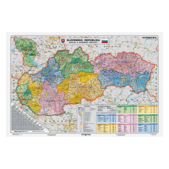Administratívna mapa Slovenskej republiky je aktualizovaná k roku 2015. Na mape vyšších územných samosprávnych celkov sú zakreslené všetky obce SR, kompletná vodná a cestná sieť. Legenda je rozšírená o štatistické údaje o jednotllivých krajoch, a to o rozlohu, počet obyvateľov, počet obcí. Súčasťou mapy je i register. Mapa je vhodná na trvalé vyvesenie. Je obojstranne laminovaná. Dodávaná s bielymi lištami s úchytom na zavesenie.