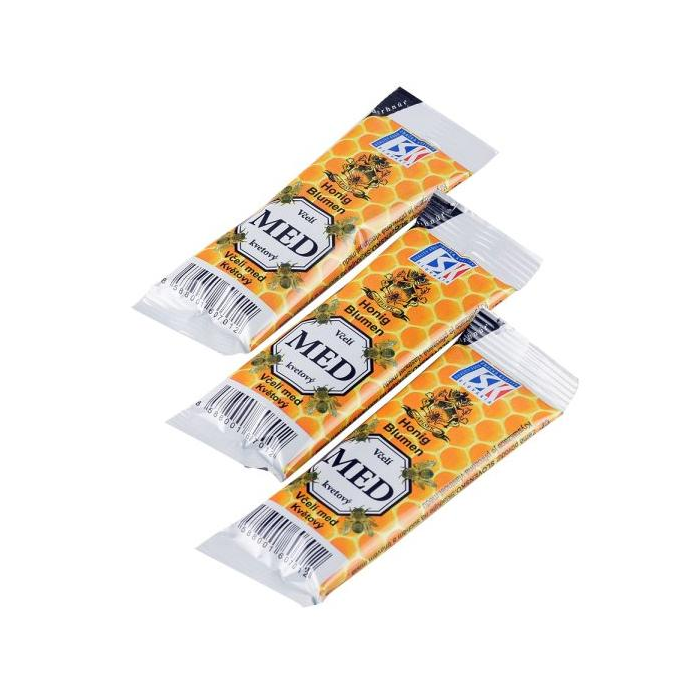 Porciovaný včelí med kvetový. Chemicky neupravovaný. Zodpovedá zásadám zdravej výživy. Balenie 100 × 20 g.