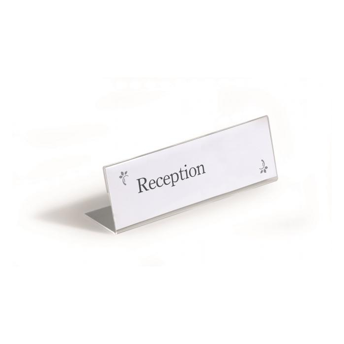 Stabilná stolová menovka „L“ profilu vyrobená z akrylu. Vhodná na konferencie, recepčné pulty, ceny tovarov a popis produktov. Väčšie balenie 10 ks. Rozmery: 61x210 mm